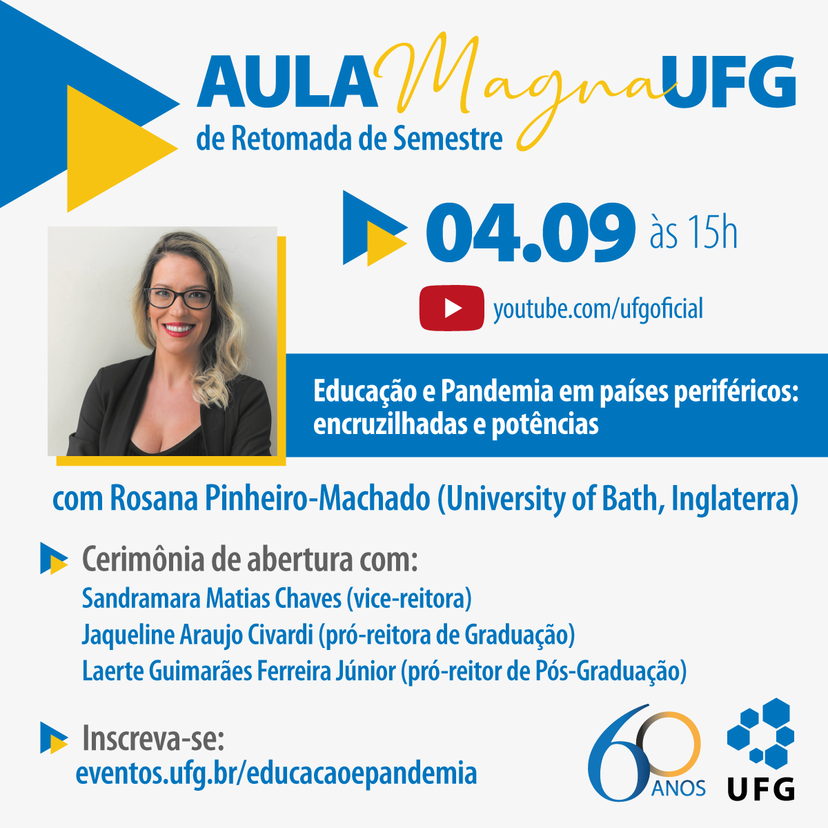 Com o retorno do semestre, foi preparada uma Aula Magna no dia 04 de Setembro, às 15h. Nela, haverá uma palestra sobre Educação e Pandemia com a Profa. Dra. Rosana Pinheiro, além de momentos de boas-vindas e explicações com a vice-reitora Sandramara e pró-reitores de Graduação. À vista disso, a SECOM/UFG solicita o auxílio dos Agentes de Comunicação na ampla divulgação do evento. Por gentileza, apliquem o banner em seus respectivos sites e, se possível, adicionem o post e o story nas redes sociais da sua Unidade. Também estamos anexando um e-mail marketing que deverá ser enviado via lista de transmissão aos alunos e colaboradores. A Aula Magna será voltada para toda a comunidade universitária, por isso, é de interesse geral que todos estejam cientes da mesma. O material em anexo também está disponível no drive dos Agentes de Comunicação, que pode ser acessado no link: eventos.ufg.br/educacaoepandemia